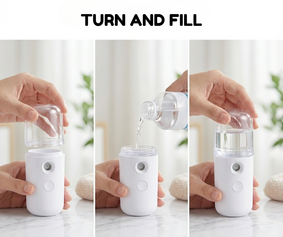 Unscrew the top tank and fill it with mineral water or your favorite facial toner. Screw it back on tightly to prevent leaks. Your hydration cocktail is ready!
