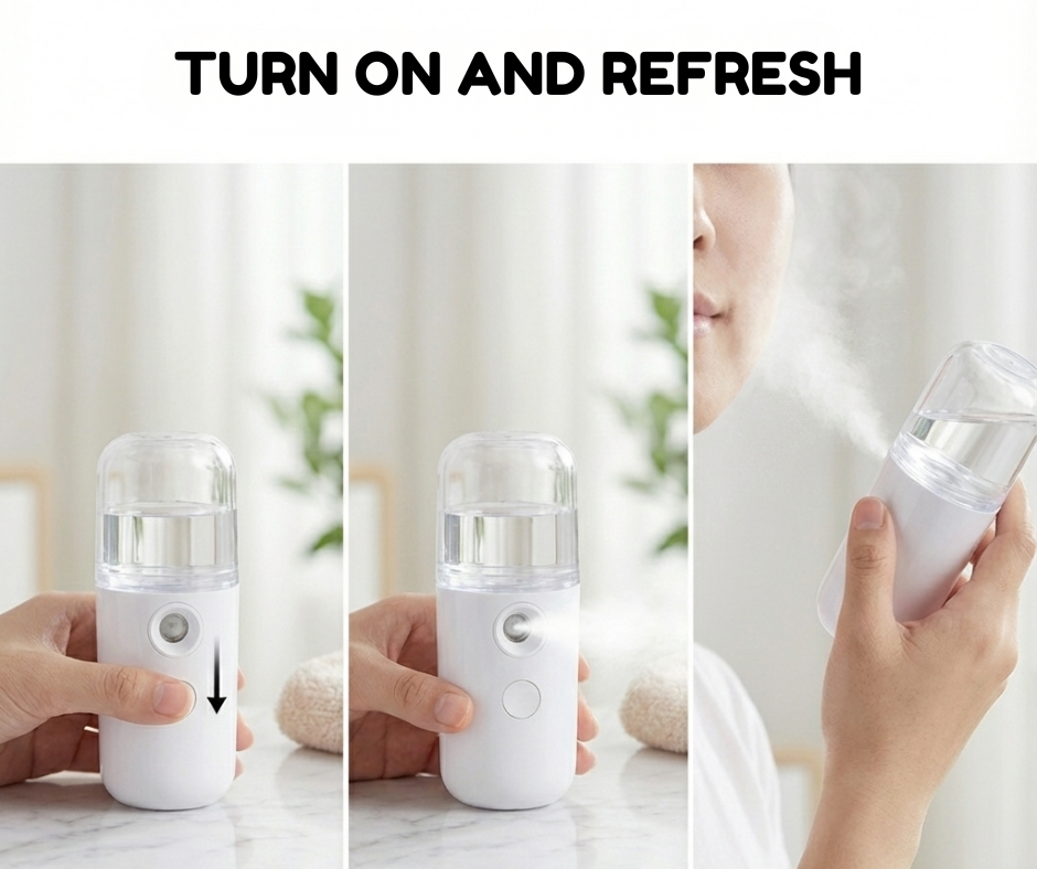 Press the power button. A cool mist will instantly be released. Hold the device about 15 cm away from your face and gently move it in circles. Feel your skin absorb the moisture without getting wet.